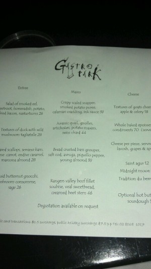Anyways so the place was called Gastro Park and the food was awesome. Everything I had was delicious. I can’t recall the full names of everything but i did get a pic of part of the menu. I know my entree had foie gras, my main had the Jurassic quail (what the heck is Jurassic about it? It sure was yummy) and a chocolate and honeycomb thing for dessert.