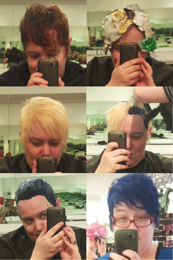 So I have a few shots under the jump of the progress. When they put the blue dye in – my hairline looked suspiciously like Eddie Munster! T.T