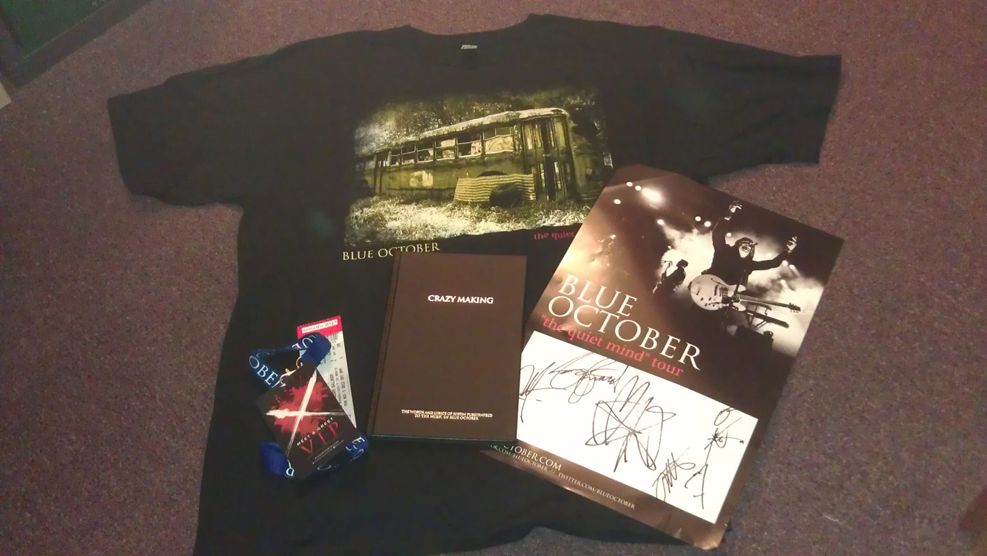 My goods from the concert – tshirt, Justins book Crazy Making, poster signed by the band, and the meet and greet lanyard thingy! 😀
